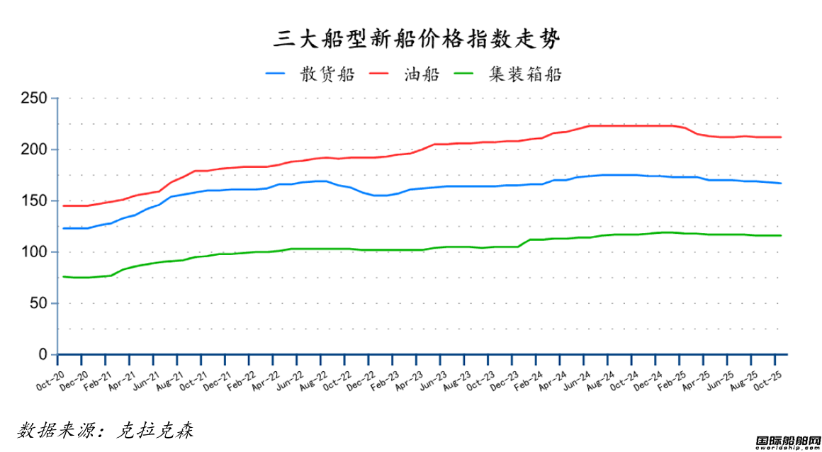 10月份散货船新船价格指数环比下跌1点,为167点;油船和集装箱船新船价格指数环比均持平,分别为212点、116点。