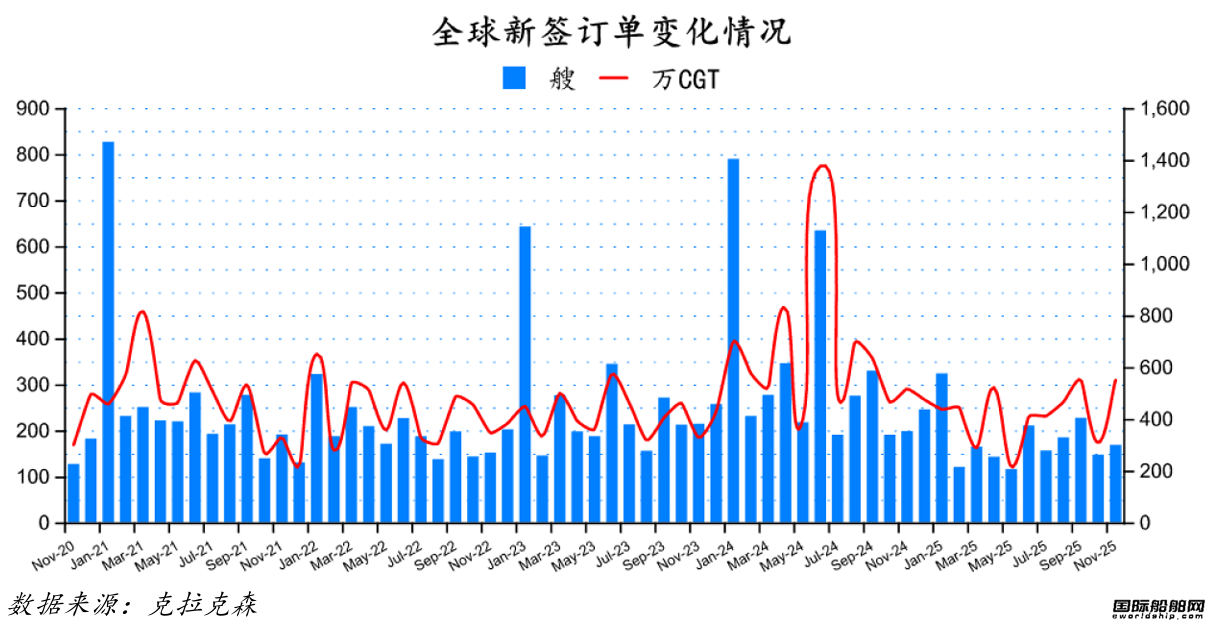 根据克拉克森最新数据统计(截至2025年12月9日),2025年11月份全球新签订单168艘,共计5,528,133CGT。与2025年10月份全球新签订单147艘,共计3,109,300CGT相比较,数量环比增加21艘,修正总吨环比上升77.79%。与2024年11月份全球新签订单198艘,共计5,192,849CGT相比较,数量同比减少30艘,修正总吨同比上升6.46%。