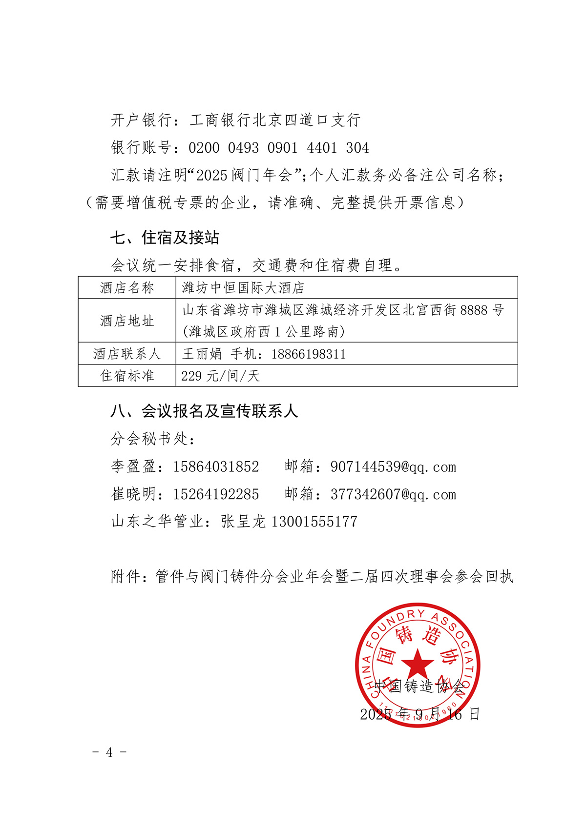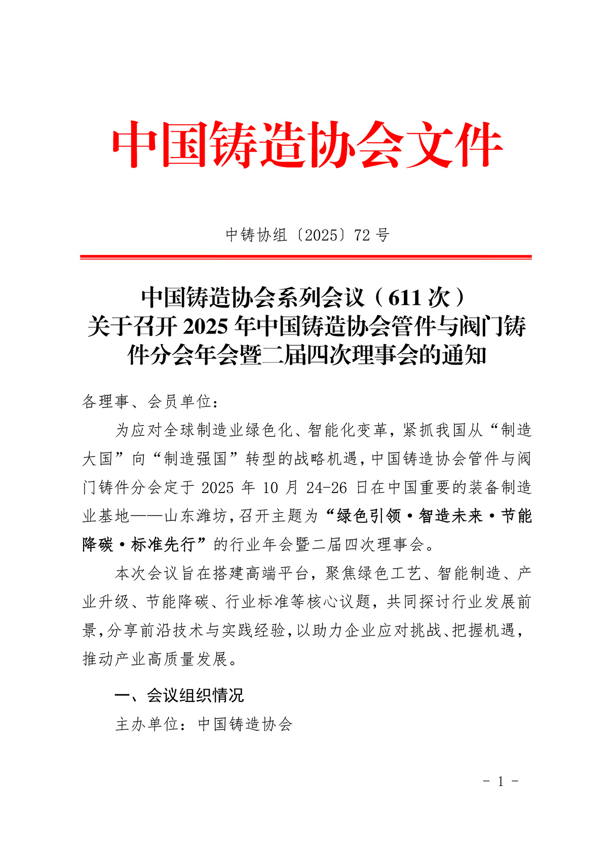 > 2025年中国铸造协会管件与阀门铸件分会年会暨二届四次理事会的通知