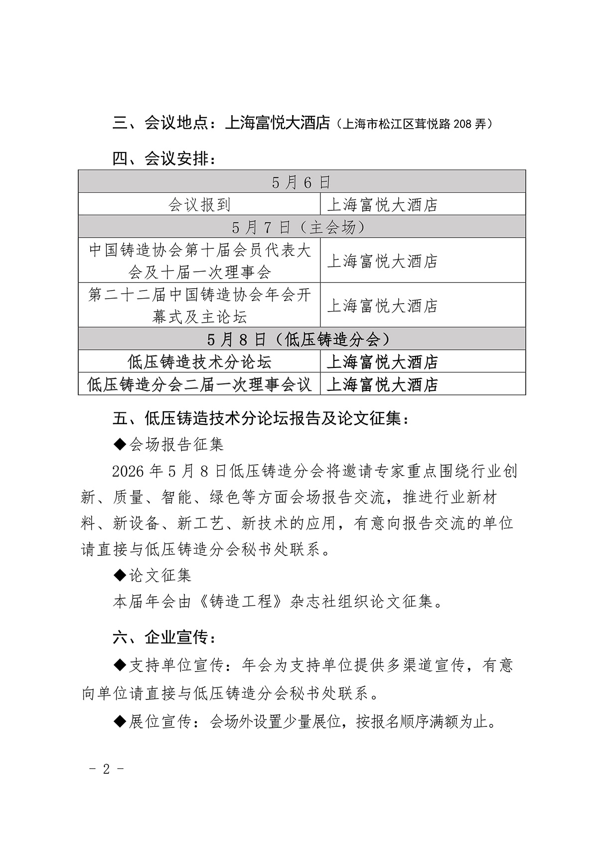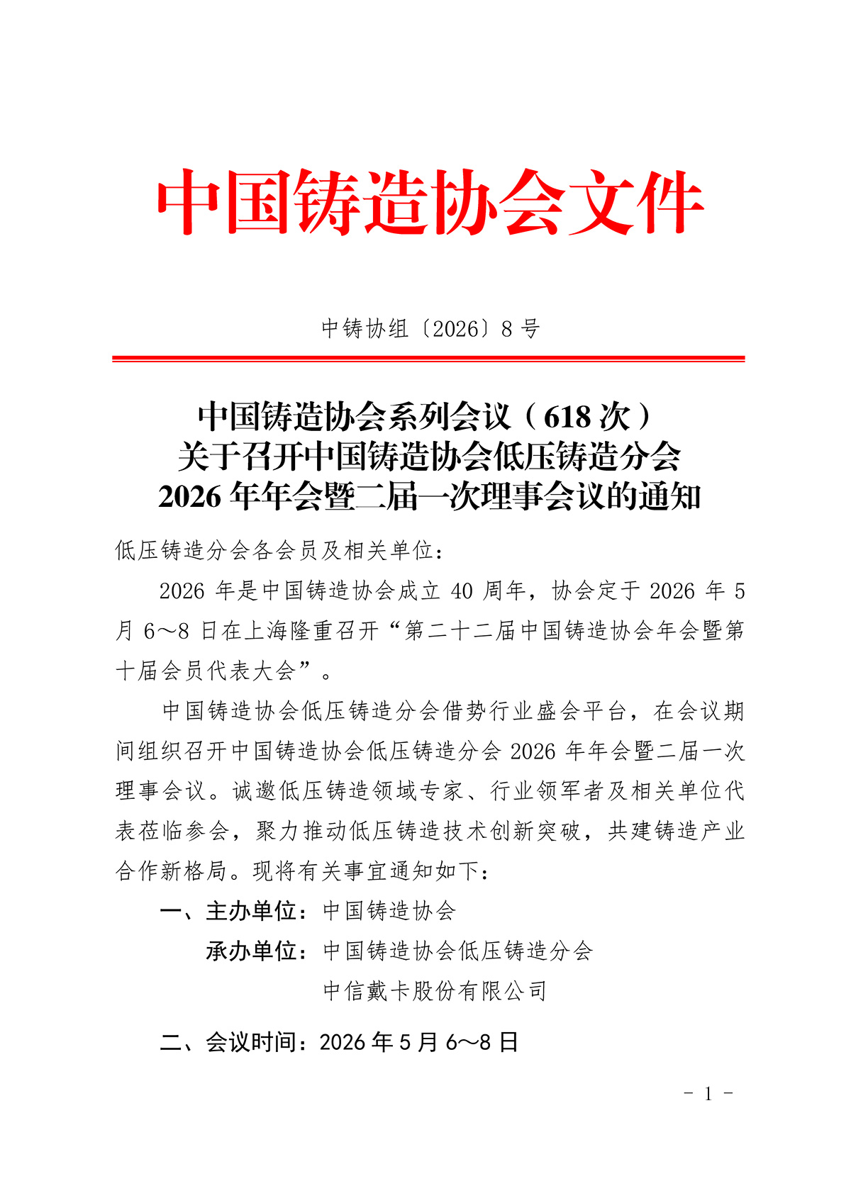> 关于召开中国铸造协会低压铸造分会2026年年会暨二届一次理事会议的通知