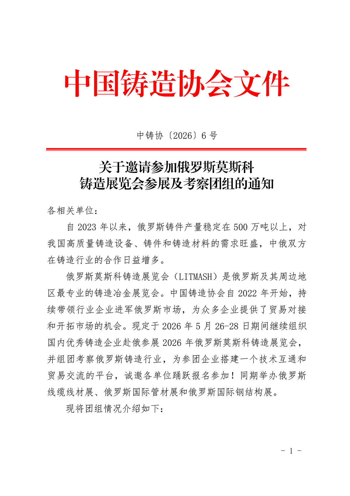 关于邀请参加俄罗斯莫斯科铸造展览会参展及考察团组的通知